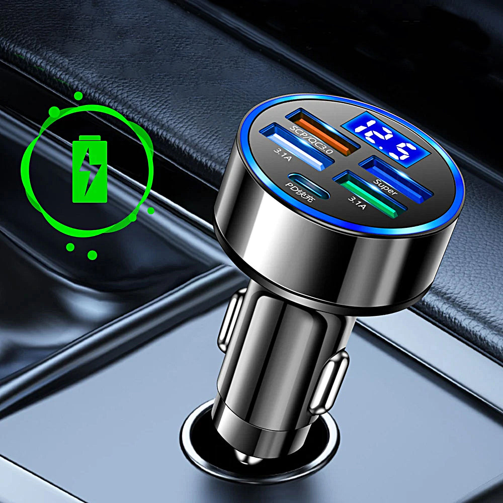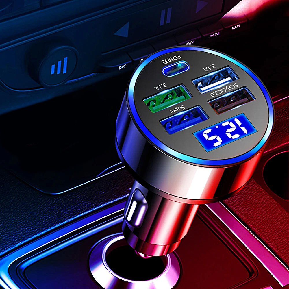 Laad tot 5 apparaten tegelijk op met deze geavanceerde autolader voorzien van USB-C, QC3.0 en een helder LED-display. Perfect voor onderweg, of je nu een iPhone, Samsung, Xiaomi of ander USB-apparaat hebt.